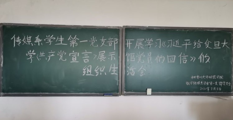 2020年7月3日上午12点30分,数字传媒系学生第一党支部在传媒楼C209组织开展学习《习近平给复旦大学(共产党宣言)展示馆党员的回信》的组织生活会,此次参会人员的有数字传媒系学生第一党支部书记徐娟同志,数字传媒系学生第一党支部第九期及第十期的预备党员。