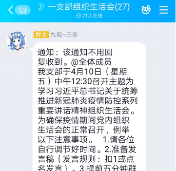 2020年4月10日上午12点30分,传媒系学生第一党支部组织开展学习习近平总书记关于新冠状病毒感染的肺炎疫情防控系列重要讲话精神的组织生活会,会议以线上形式进行开展,此次参会人员有传媒系学生第一党支部第七期党员,第八期及第九期的预备党员。