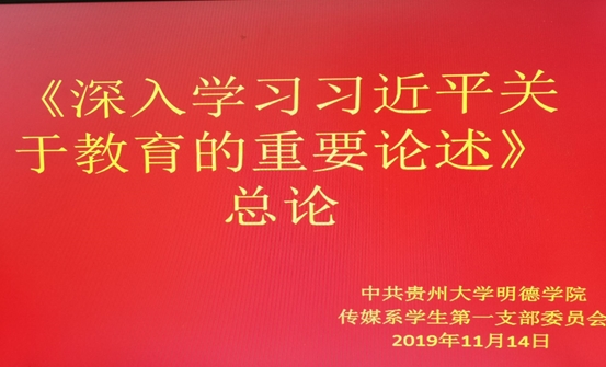2019年11月14日19点整,传媒系学生第一党支部在土木楼D403组织开展《深入习近平关于教育的重要论述》总论的主题教育,此次参与学习人员有传媒系学生第一党支部正式党员一名,第七期、八期、九期预备党员。