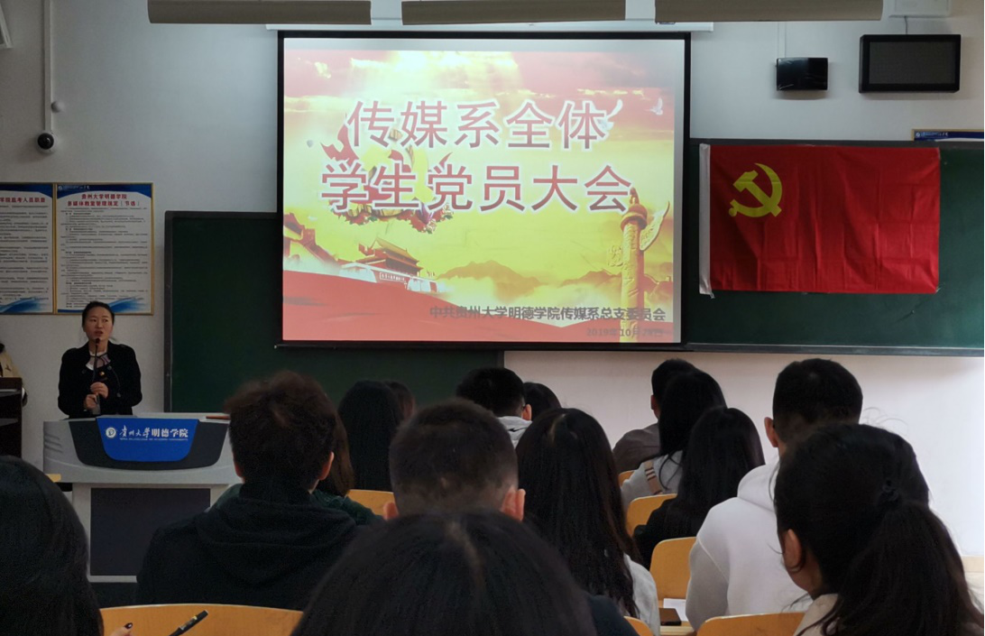 2019年10月24日上午12点10分,传媒系党总支开展全体党员大会,地点在A517,此次活动分为三个阶段,第一阶段由传媒系党总支副书记曾林同志为此次活动讲话,第二阶段由传媒系学生第一支部书记徐娟同志作“不忘初心,牢记使命”主题教育学习的要求,第三阶段由传媒系学生第二支部书记谭琼同志带领新党员作入党宣誓。