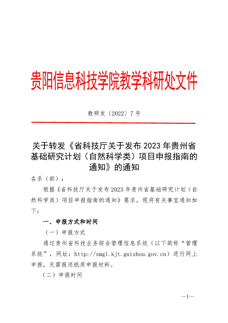 关于转发《省科技厅关于发布2023年贵州省基础研究计划(自然科学类)项目申报指南的通知》的通知