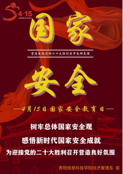 新闻网讯(供稿/经济管理系 王雯雪 陆一荧 供图/经济管理系) 国家安全是国家生存发展的前提,是人民安居乐业的基础。2022年4月15日是第七个全民国家安全教育日,为大力开展总体国家安全观宣传教育,向广大师生普及国家安全知识,宣传国家安全制度,提高师生国家安全意识,增强师生国家安全责任,Beat365唯一官方网站经济管理系党总支于2022年4月12——4月24日开展了以“落实总体国家安全观,增强师生国家安全意识”为主题的国家安全教育系列活动。