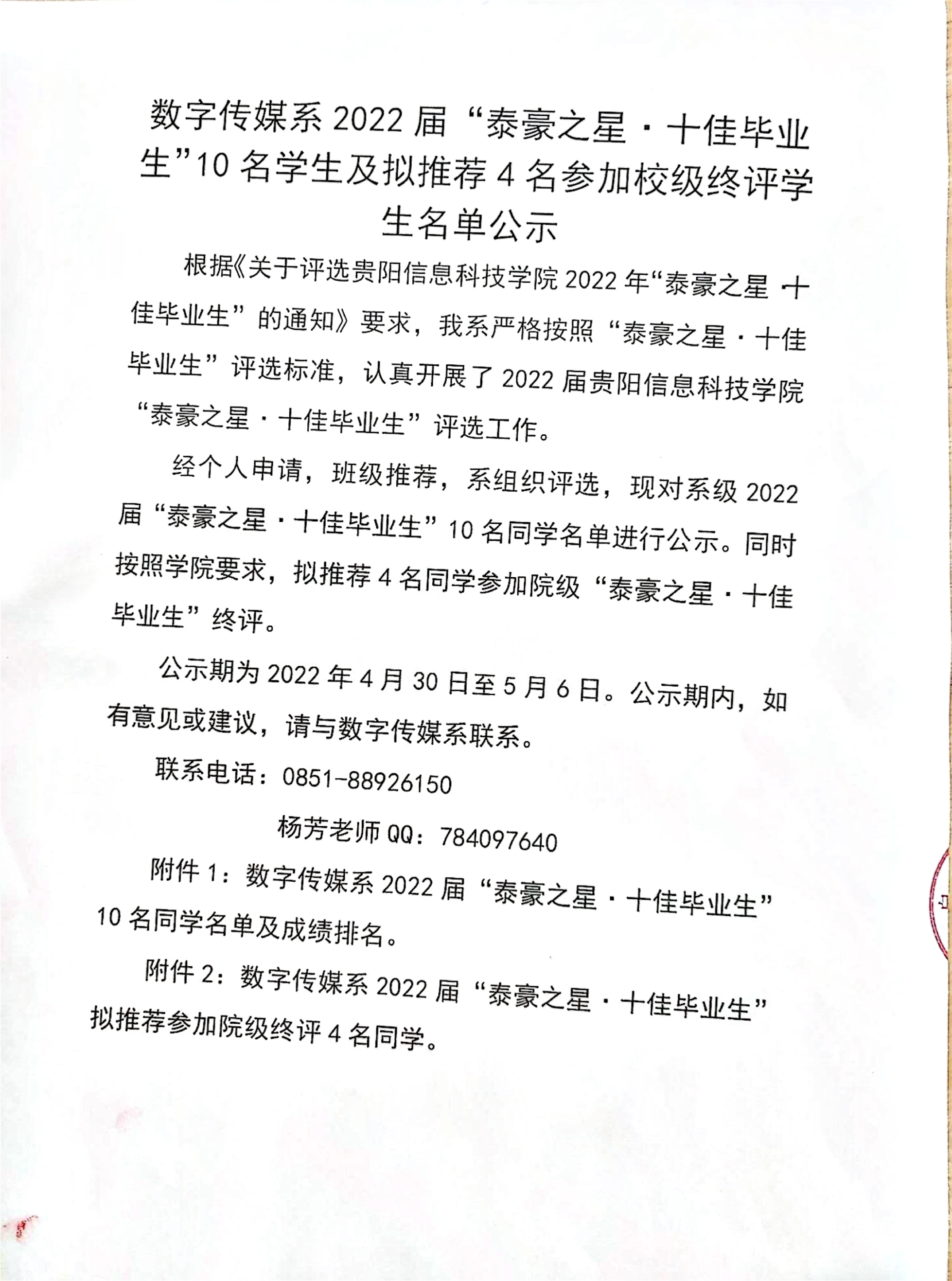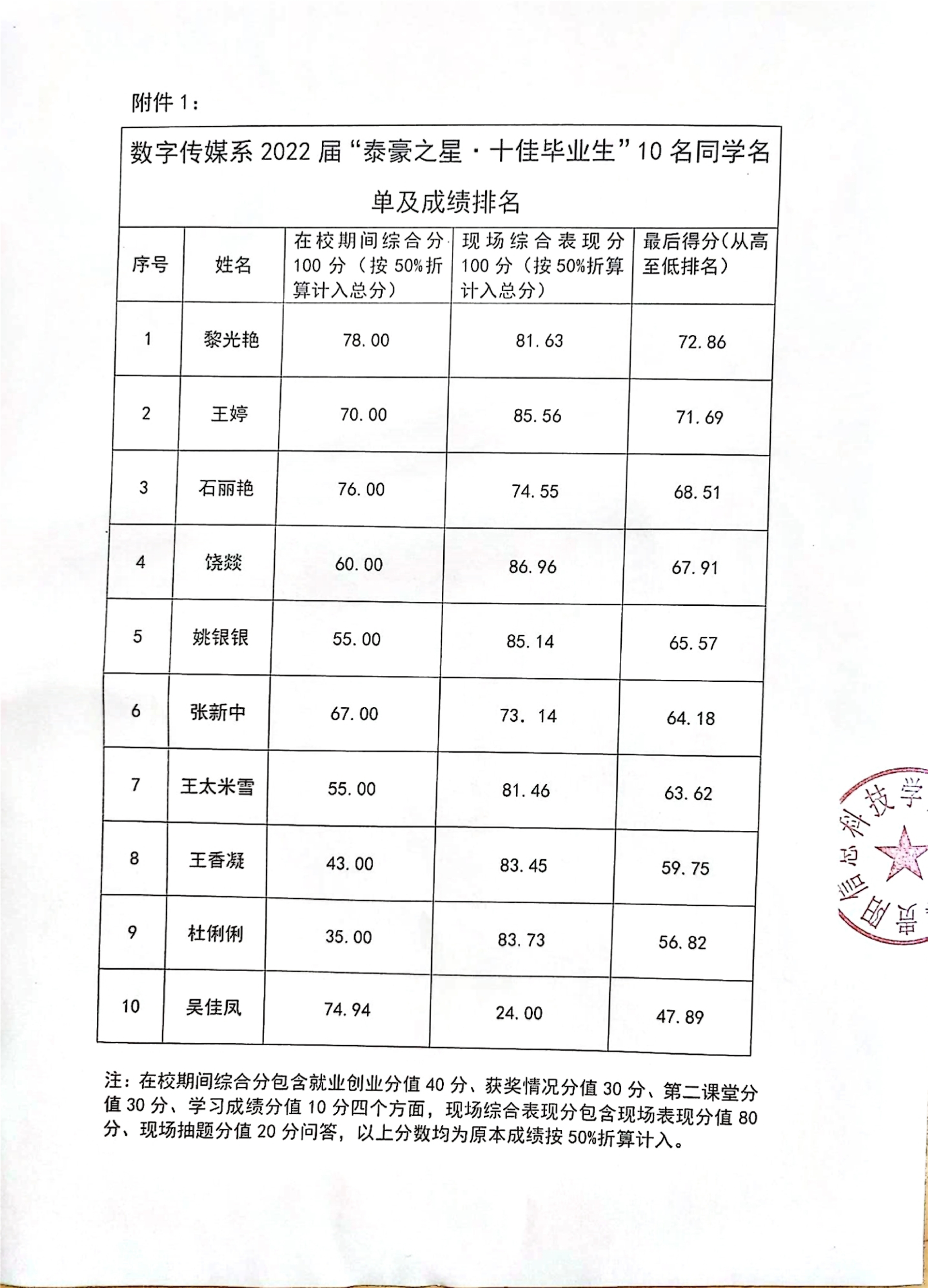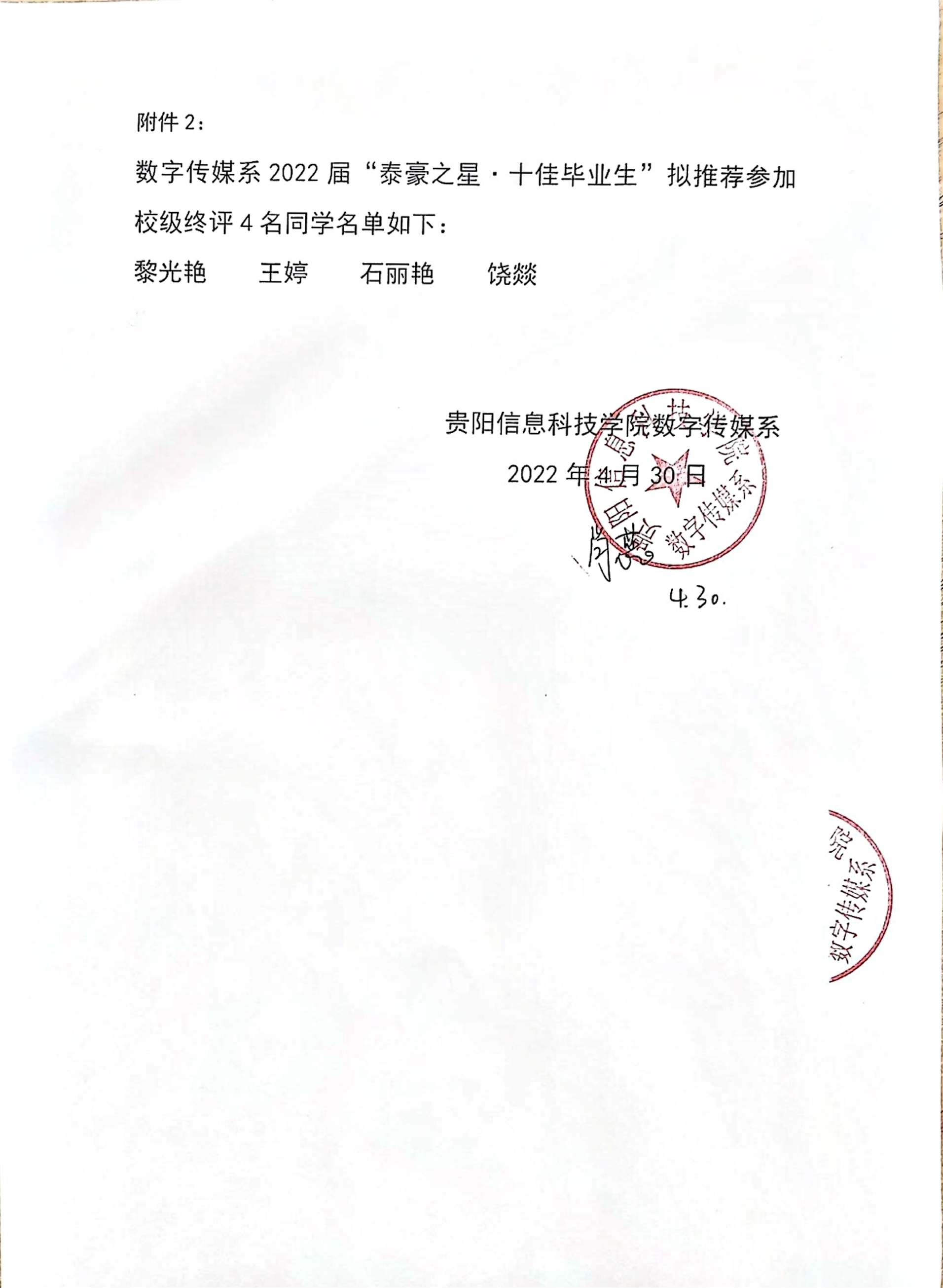 数字传媒系2022届泰豪之星十佳毕业生公示名单