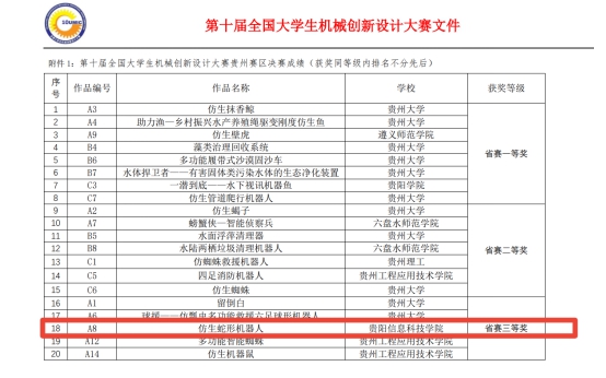 为展示我省各高校大学生的创新才能,推动机械学科教育教学改革,全国大学生机械创新设计大赛贵州赛区组委会决定组织开展第十届全国大学生机械创新设计大赛贵州赛区预赛,于2022 年6月 24 日至 6 月 25 日在贵州大学举行。在本场比赛中校领导高度重视,认真部署,在智能工程系系部指导老师梁刚老师与马雄位的细心指导下,我系学子袁勋,王烽,王涛涛,李达,杨伟荣获贵州省省级三等奖的好成绩。