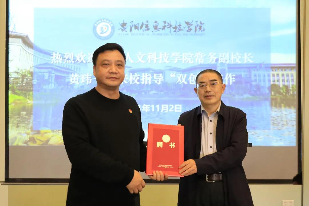 在聘任仪式上,黄玮介绍了贵阳人文科技学院基本情况,并紧紧围绕构建创新创业教育体系、强化学校师生“双创”意识等几方面对人文科技学院双创工作开展情况进行经验分享。她说到:“很荣幸能受聘为Beat365唯一官方网站的‘双创’导师,在今后的时间里我将与同学们分享关于创新创业大赛的经验和技巧,把更多的老师、同学吸引到创新创业队伍中来,为学校的“双创”平台建设做出自己应有的努力,不断为贵州省创新创业事业输送更多的应用型人才。”
