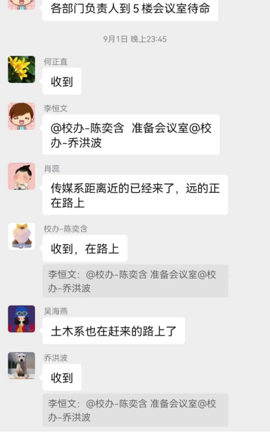 星夜奔赴,只为那片星辰大海。9月1日将近午夜,多名教职工接到学校办公室的电话和信息后,来不及多想,随手装几件换洗衣服便奔赴学校。学校办公群中不断闪现令人安心的消息:“党群工作部马上到位”“信息系辅导员队伍已经在路上”“传媒系距离近的已经来了,远的正在路上”……还有的老师因为部分路段封路,担心不能到校开展防疫工作,在工作群中发出“求助”信息,“甲秀南路封路了,怎么办?”“被交警拦住了怎么办?”在得知这些老师是到校开展疫情防控工作的,交警们按照程序给与放行。当天夜里便有91名教职工到达学校,参加完学校疫情防控工作会后,连夜搭建30个核酸检测采样台和采样通道。他们彻夜未眠,只为更好更快的做好准备工作等待医护人员到位,随时开展核酸检测工作。在被问到“你家孩子怎么办?”时,老师们的回答出奇一致:“我必须来,我不来我们班的学生娃娃怎么办!”