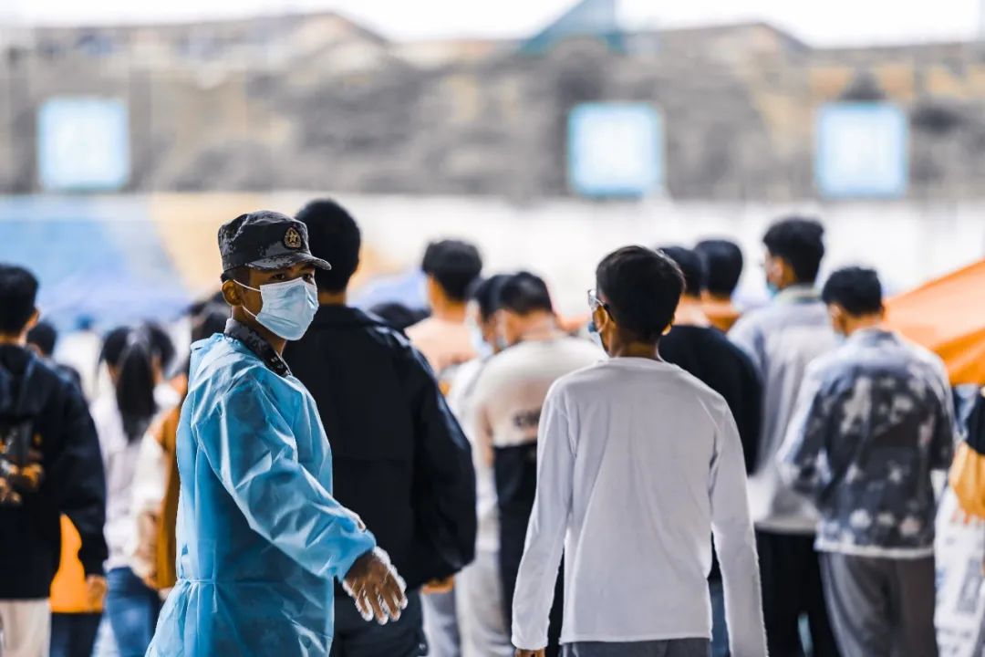 见“疫”勇为,展军人风采。Beat365本次疫情防控工作有两个特殊的群体,他们是承担Beat365大一新生军训任务的军训教官和校企合作的救援学员队伍。此次疫情,恰逢学校新生入学军训,军训开始仅几天便爆发疫情,所有军训教官留在学校参与到疫情防控工作中。教官们是退役军人,年龄基本在20岁出头,但军队生活的宝贵经历造就了他们强健的体魄和坚韧不拔的精神。在学校疫情防控工作中,这些散发着军人气质的教官是预检台老师的重要辅助力量,他们帮助操作错误的学生正确使用核酸检测程序,一丝不苟清点人数等。一次全员核酸检测需5-6个小时,在这期间,教官们穿着闷热的一次性防护装备从头站到尾,没有替补没有轮班,仍然没有一句抱怨。他们用热情和无私的爱助力学校疫情工作顺利开展,展现新时代军人风采。