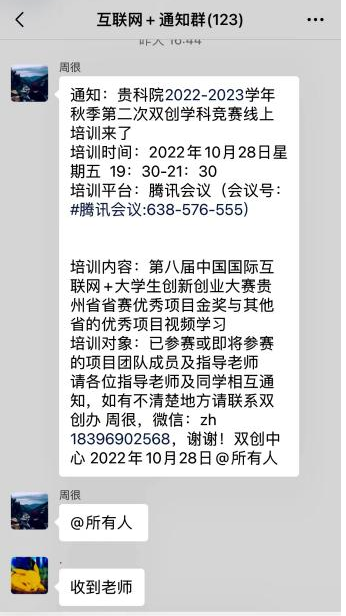 疫情当下,为响应学院双创、学科竞赛政策及领导指示,达到“参大赛、获大奖、拿金奖”目标,为此双创中心组织学生在腾讯会议上开展贵科院第二次双创学科竞赛线上培训。本次参与培训参会的有已参赛或即将参赛的项目团队成员及指导老师,由双创中心周很主持。参会人数达六十余次。