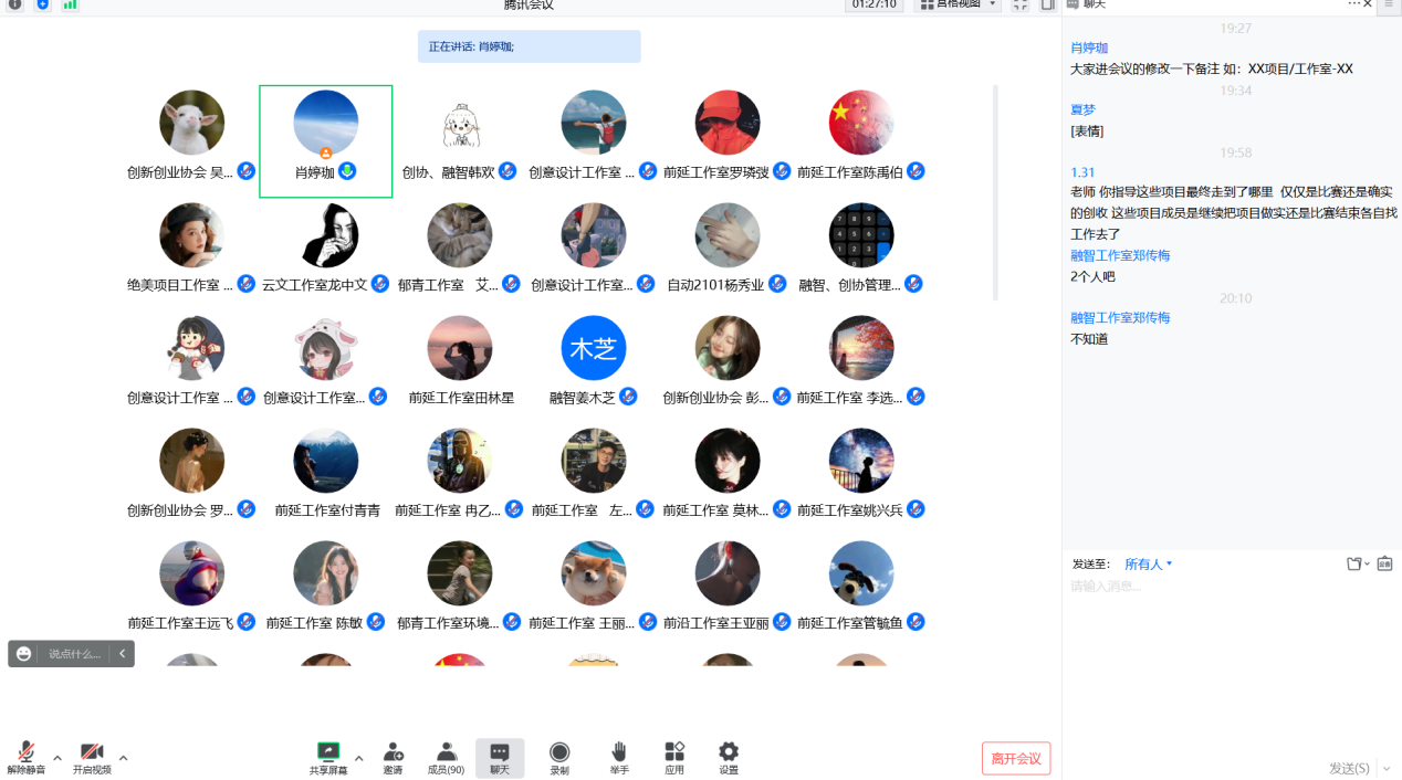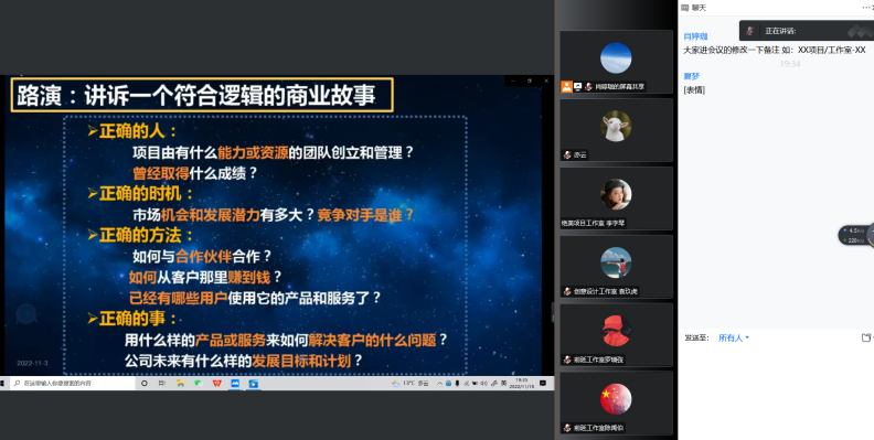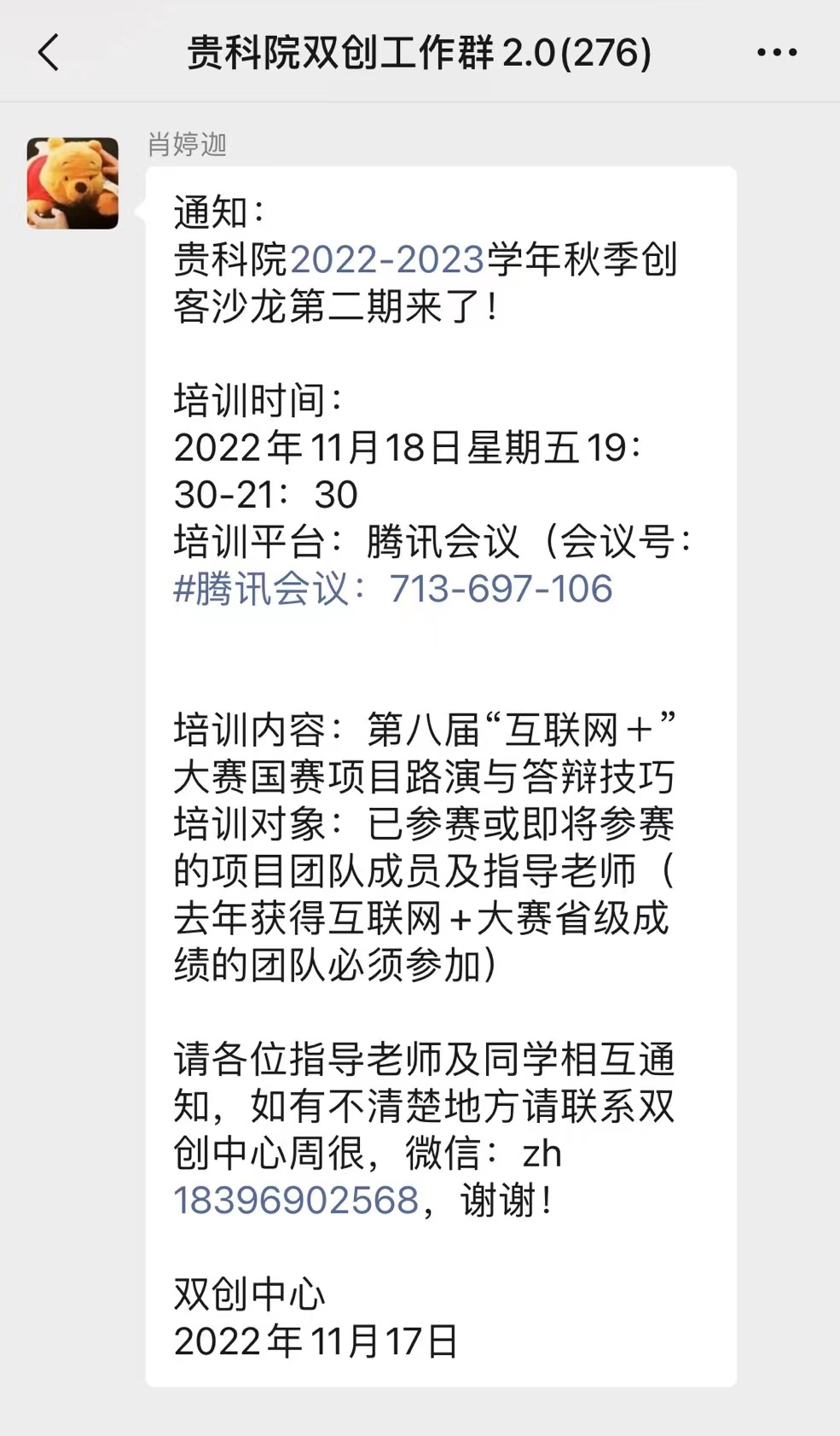 为响应学院双创、学科竞赛政策及领导指示,达到“参大赛、获大奖、拿金奖”目标,同时进一步提升贵科院学子创新创业大赛的能力。在11月18日晚上,双创中心组织学生在腾讯会议上开展贵科院创客沙龙飞第二期线上培训。本次参与双创中心主任夏梦、各系双创老师以及已参赛或即将参赛的项目团队成员以及去年获得互联网+大赛省级成绩的团队,由双创中心周很主持。