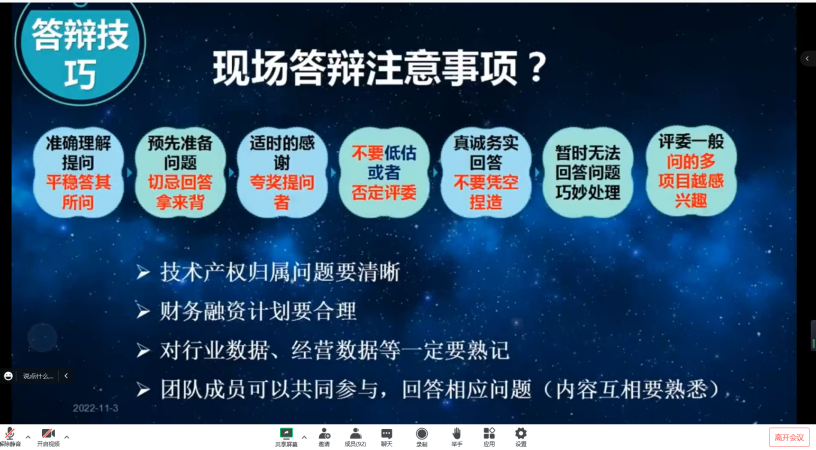 通过本次培训,同学们找到了竞赛的创新思维的方法,了解到了作为一名参赛选手在赛场上如何巧妙获得评委的肯定,同时也体现出了同学们对于知识的渴求。在学习自身专业的时间之余,同学们对于学习创新创业大赛知识的热情也不减,纷纷积极参与会议互动之中,提出自己的疑问,双创中心老师在线根据自身经验为同学们解惑。