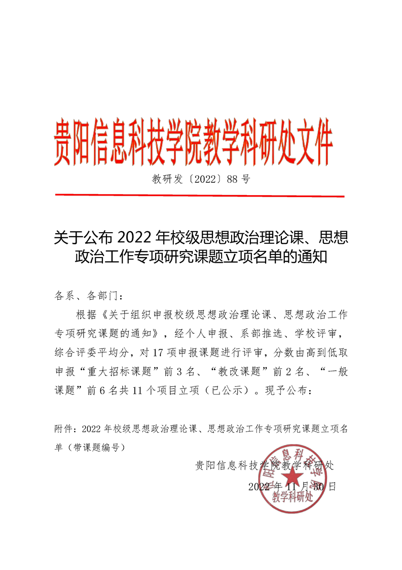 关于公布2022年校级思想政治理论课、思想政治工作专项研究课题立项名单的通知