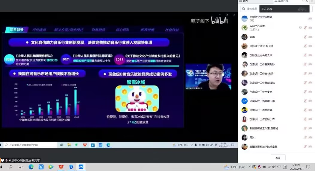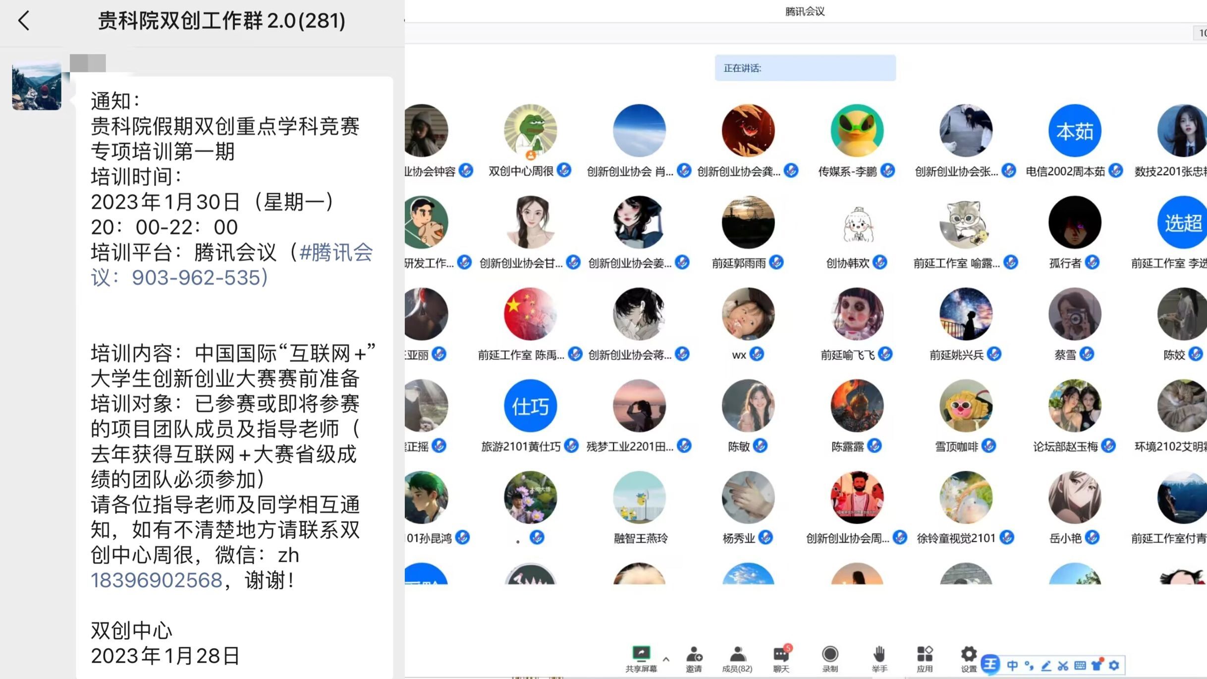 首期于2023年1月30日通过腾讯会议平台开展,本次假期线上培训的主要为中国国际“互联网+”大学生创新创业大赛做赛前准备,此次培训对如何组建参赛团队和准备比赛项目做一些详细介绍。紧接着,老师提出了一些比赛技巧,团队贴切的分配、合理的成员配置、成员的学科交叉成为团队能够成功脱颖而出的必备条件。