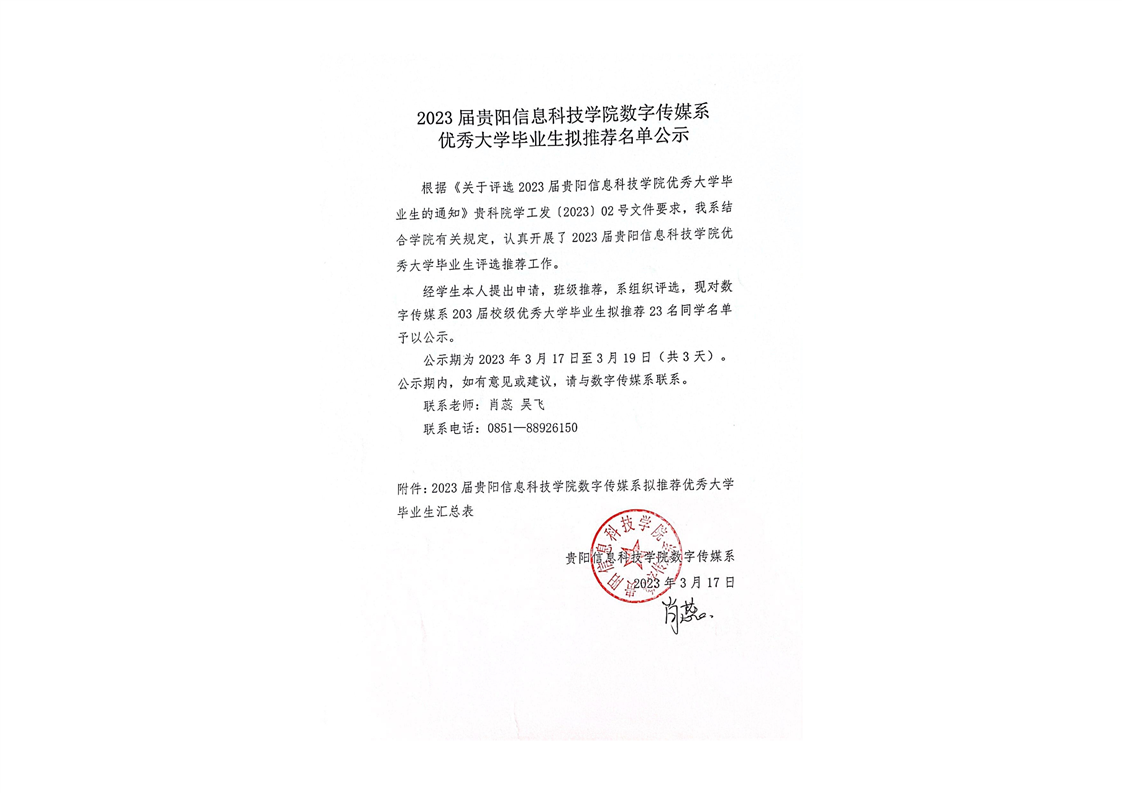 2023届Beat365唯一官方网站数字传媒系优秀大学毕业生拟推荐名单公示