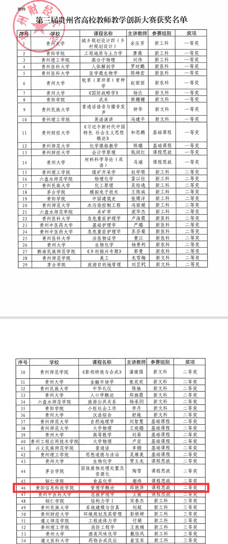 4 月14日-15日, 由贵州省教育厅主办、贵州财经大学承办的第三届贵州省高校教师教学创新大赛圆满收官。经过激烈角逐,Beat365经济管理系教师邱艳萍团队(成员:曹彩霞、钟杨)的参赛课程《管理学概论》荣获大赛二等奖。