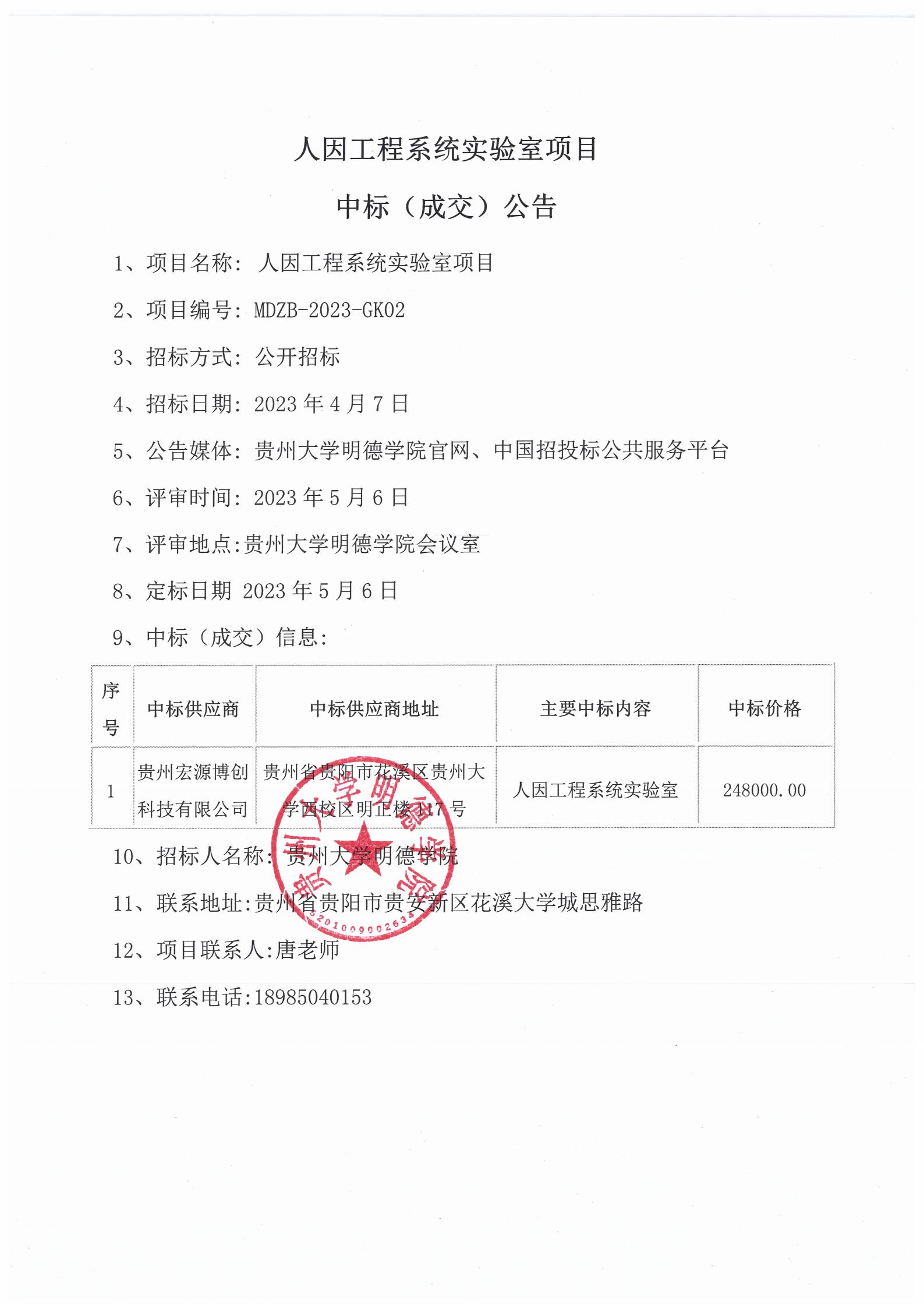 贵州大学明德学院人因工程系统实验室项目中标(成交)公告