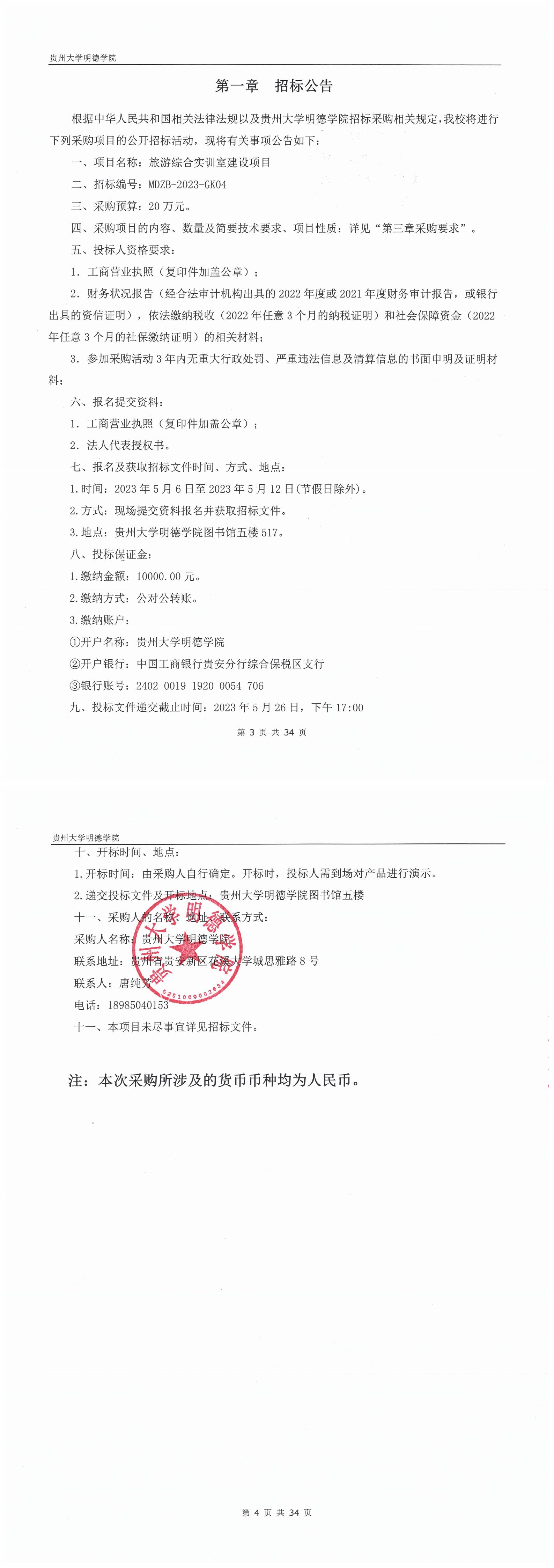 贵州大学明德学院旅游综合实训室建设项目招标公告