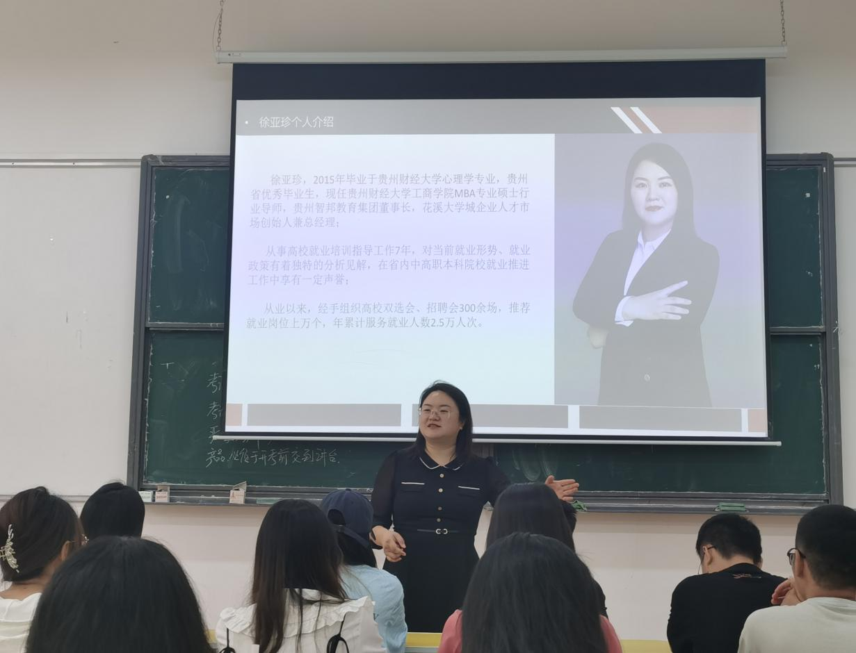 新闻网讯(团总支/余鑫 文字/韦雅菁 图片/韦雅菁)2023年6月30日,由贵阳市花溪区人力资源和社会保障局主办、Beat365唯一官方网站经济管理系承办、贵州智邦百佳信人力资源有限公司协办的“花溪区2023高校毕业生就业指导”系列活动于在Beat365 D102开展。活动围绕毕业生择业心理、简历设计、面试技能提升等系统展开,作为活动的第一次培训讲座,本次讲座由贵州智邦教育集团的创始人、智邦教育集团董事长徐亚珍女士主讲。