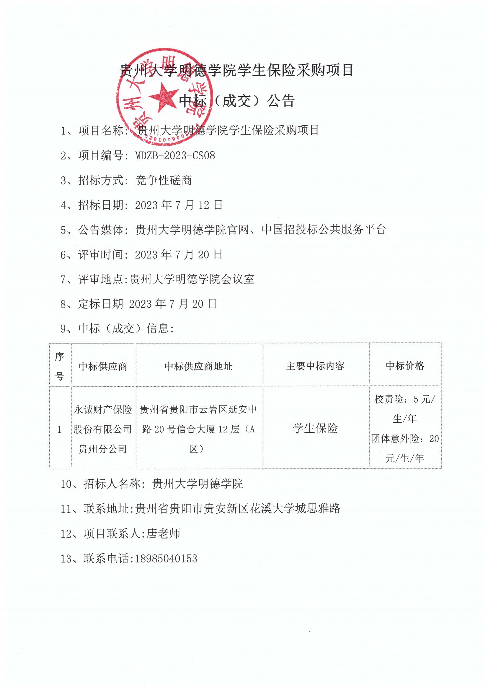 贵州大学明德学院2023年至2025年学生军训服装采购项目中标公告