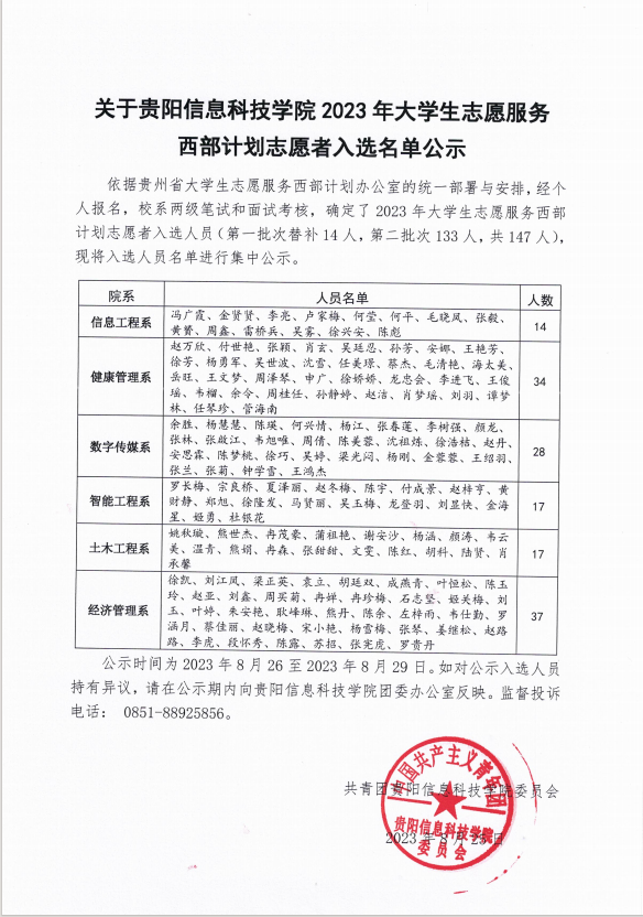 关于Beat365唯一官方网站2023年大学生志愿服务西部计划志愿者入选名单公示