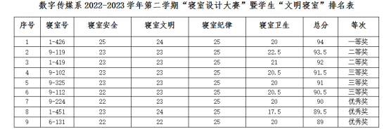 截止2023年6月26日完成最终评比,最终评选出9个优秀的寝室: