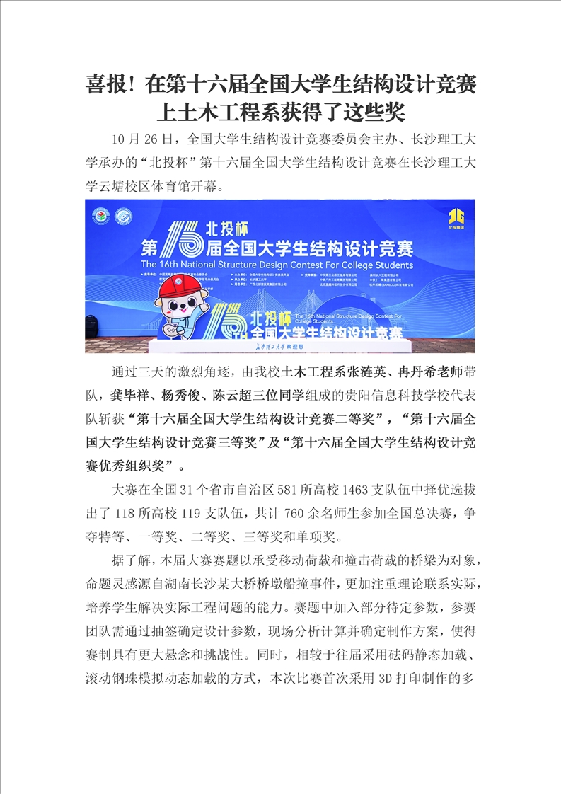 喜报!在第十六届全国大学生结构设计竞赛上Beat365唯一官方网站获得了这些奖