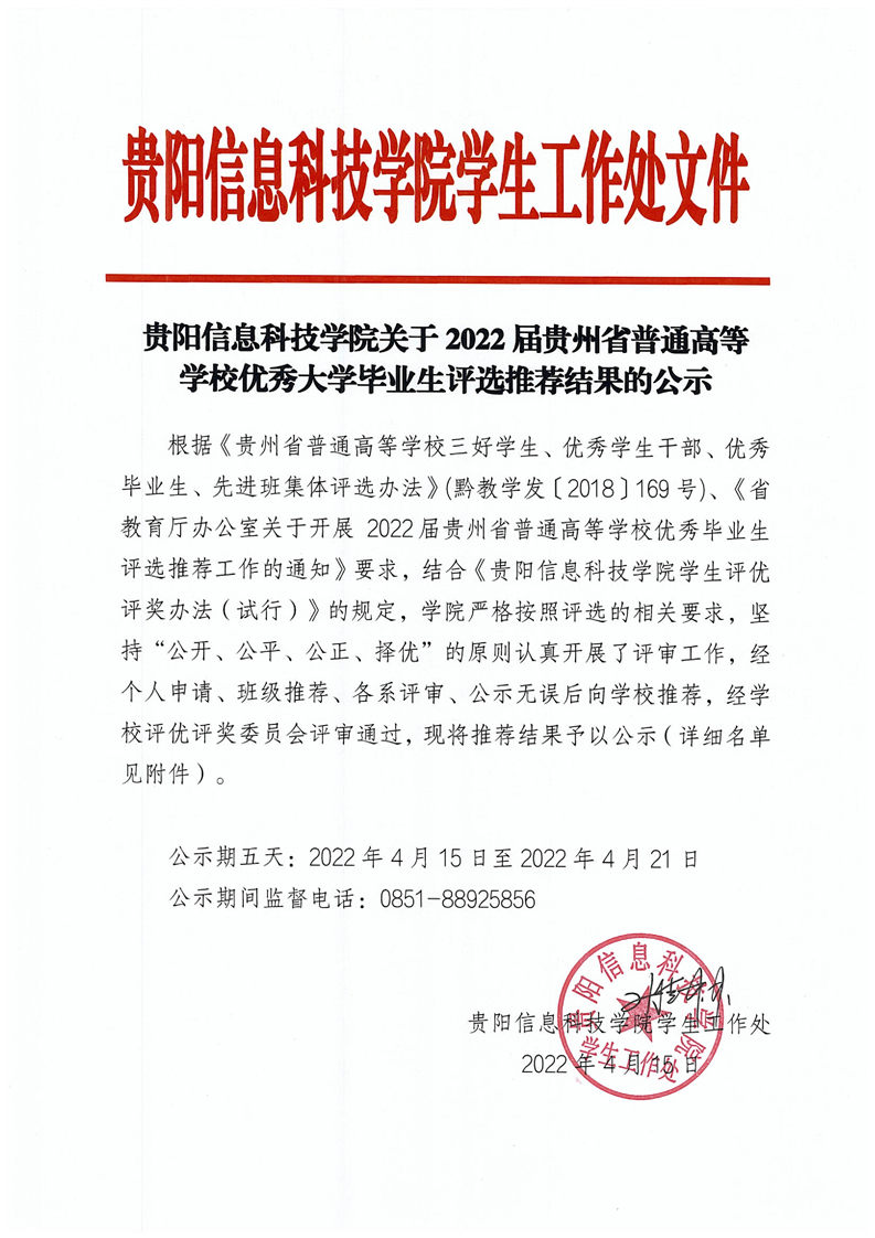 Beat365唯一官方网站关于2022届贵州省普通高等学校优秀大学毕业生评选推荐结果的公示