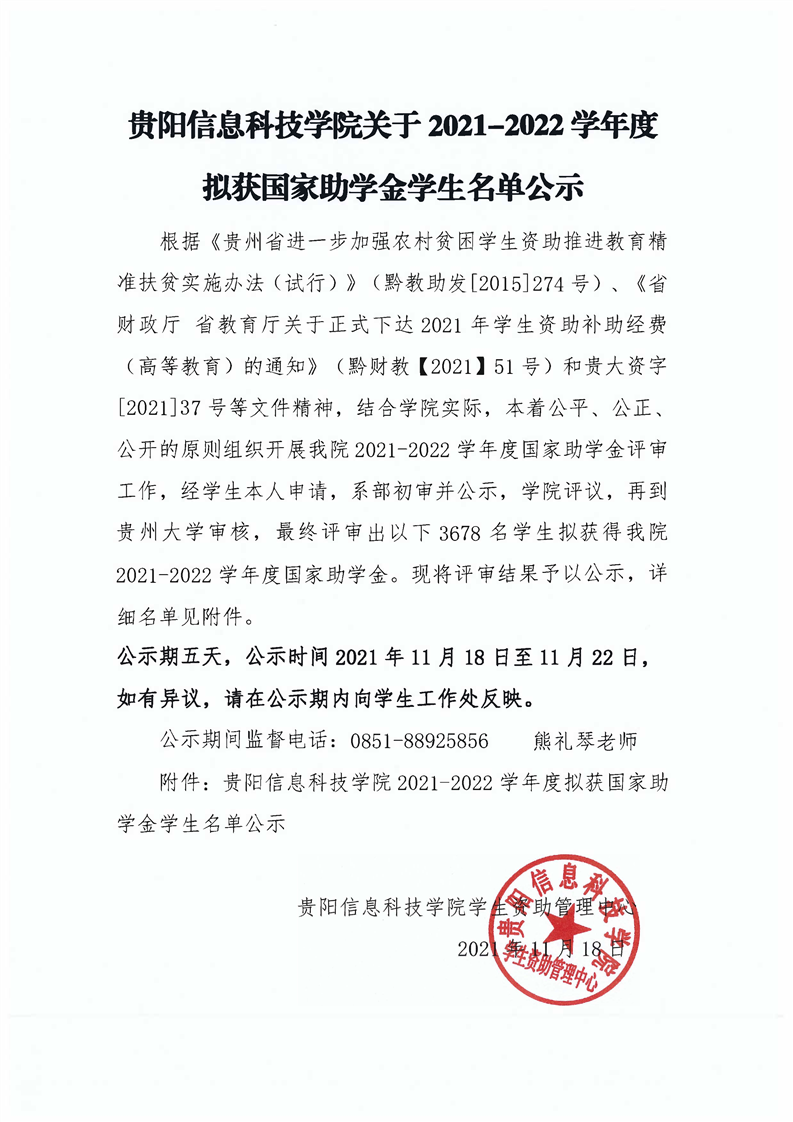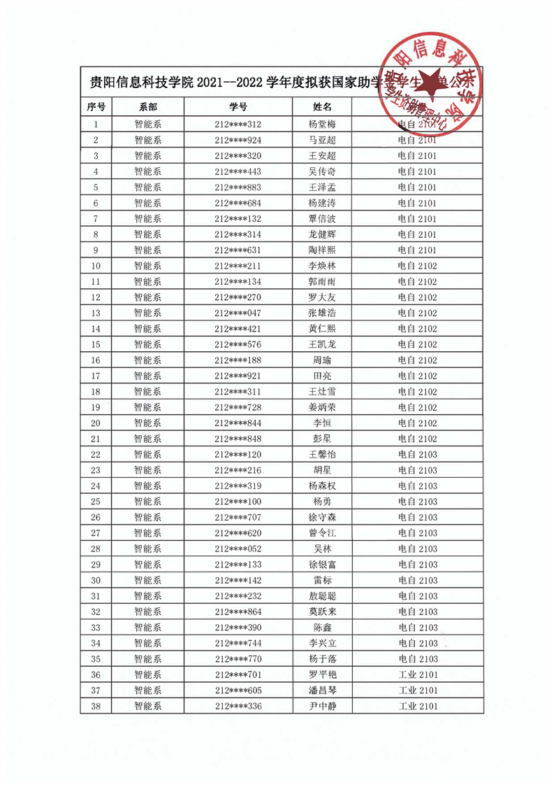 Beat365唯一官方网站关于2021-2022学年度拟获国家助学金学生名单公示