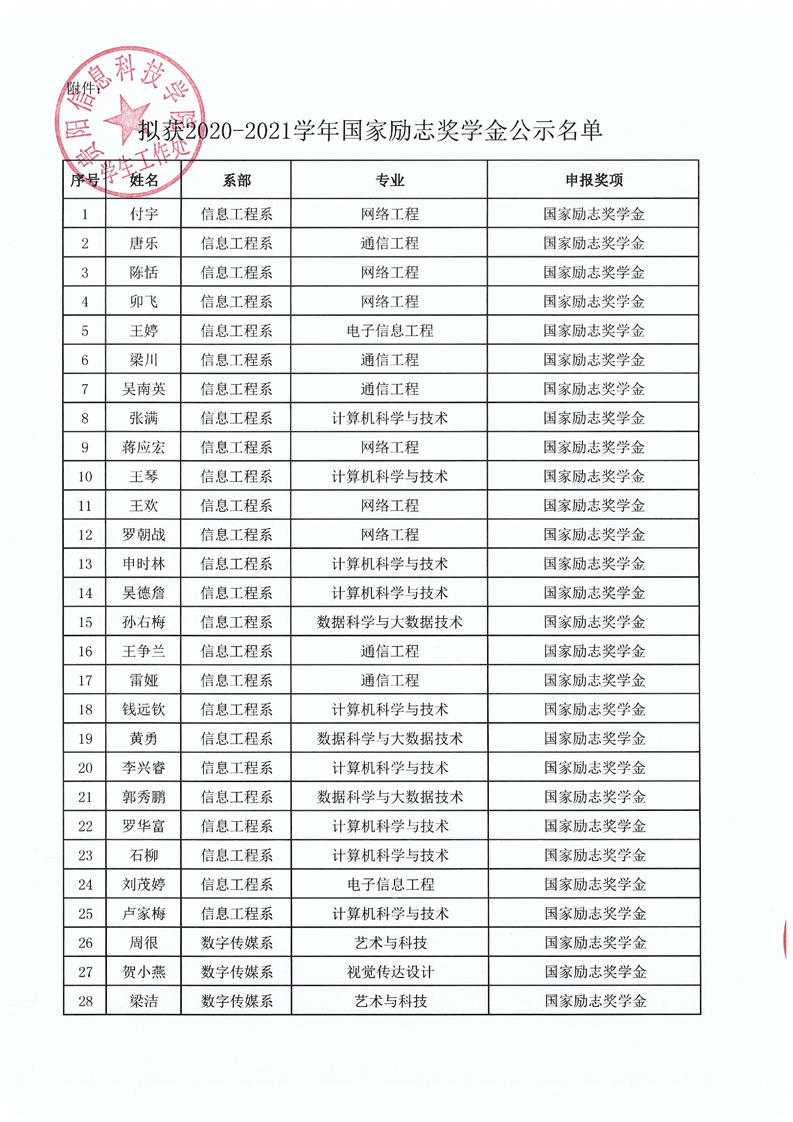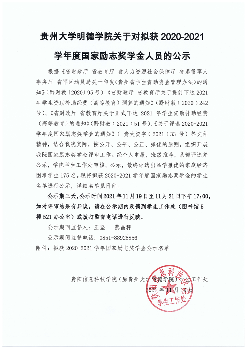 贵州大学明德学院关于对拟获2020-2021学年度国家励志奖学金人员的公示