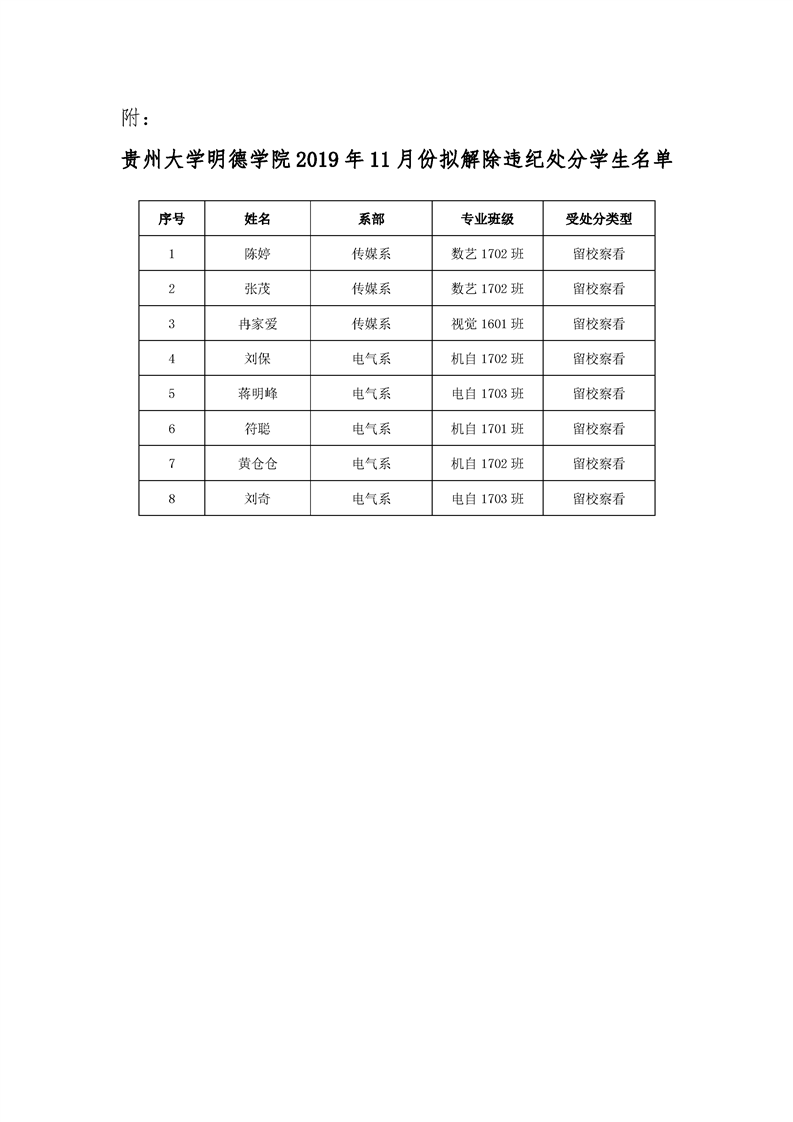 贵州大学明德学院关于解除陈婷等8名学生违纪处分的公示