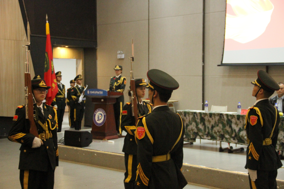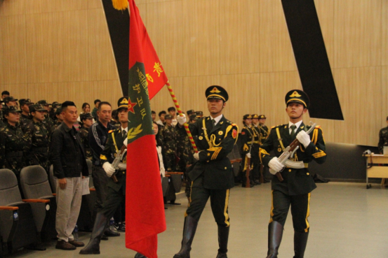 全体新队员接过使命与责任庄严宣誓:自觉接受爱国主义教育,增强爱国主义情怀,遵守队内章程,努力学习、刻苦训练、团结一致、以身作则,坚决完成护旗任务,为国旗添彩、为学院争光。