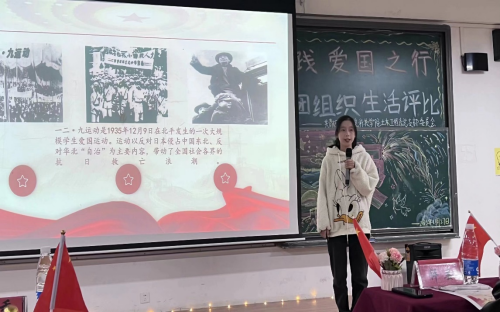 缅怀革命先烈,传承红色基因。来自工管2301班的讲解员刘蓉蓉,为我们讲述了一二·九运动的革命意义,增强了青年一代的爱国信念。并且分享了班级实践活动影像和团员的心得,展示了他们制作的手工艺品“五星照耀前行,党旗指引方向”以爱国情怀为指引,传承红色基因,青年责无旁贷。