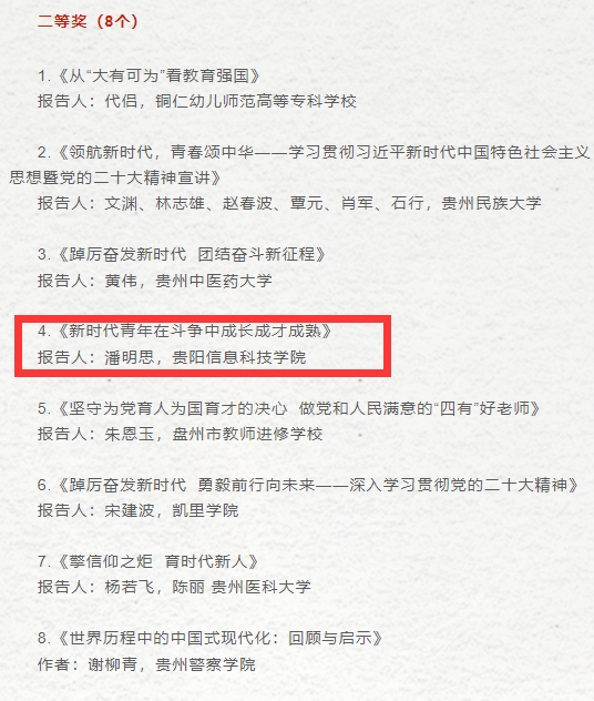 近日,省委教育工委、省教育厅组织开展了全省教育系统学习宣传贯彻党的二十大精神理论宣讲评选展示活动,通过组织推荐、专家评审,马克思主义学院副院长潘明思撰写的“新时代青年在斗争中成长成才成熟”报告,参加全省教育系统学习宣传贯彻党的二十大精神理论宣讲评选展示活动中“荣获优秀理论宣讲报告”二等奖,是全省民办高等院校唯一的获奖作品。