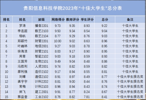 经由师生组成的评委团现场打分,综合网络投票分,最终评选出罗涛、李连超、杨帆、郑颖竹、叶巍林、徐海浪、周青、王国芳、冯胜利、廖利强十名同学荣获学校2023年“十佳大学生”荣誉;刘蝶、龚宇宇、常梅、熊飞、蔡益奎五名同学荣获学校2023年“十佳大学生”提名奖。