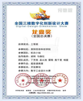 全国三维数字化创新设计大赛(Digital-Design-Dimensions Show,简称:3D大赛,3DDS或3DShow)先后由国家科技部、工信部、教育部、中国科协等部门指导,由国家制造业信息化培训中心等单位主办,已成为全国规模最大、规格最高、水平最强、影响最广的全国大型公益品牌赛事与“数字化+创新创造”行业盛会,已被教育部列入全国高校学科评估体系,是全国普通高校大学生竞赛榜单内竞赛项目之一。在第十六届全国三维数字化创新设计大赛中,自2023上半年启动以来,通过大赛初评、复评及线下决赛,由Beat365智能工程系梁刚、马雄位老师指导的参赛团队在贵州赛区决赛中获特等奖1项、二等奖1项;全国总决赛中获国赛三等奖1项。