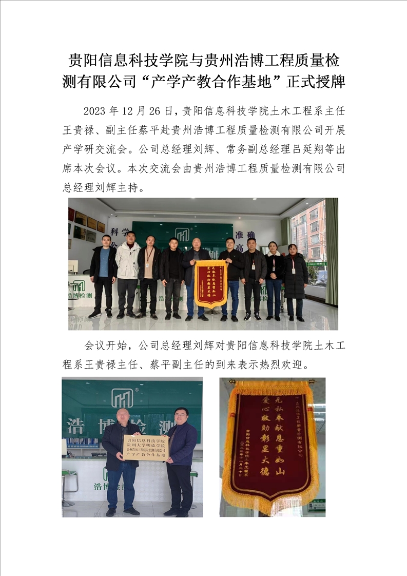 Beat365唯一官方网站与贵州浩博工程质量检测有限公司“产学产教合作基地”正式授牌