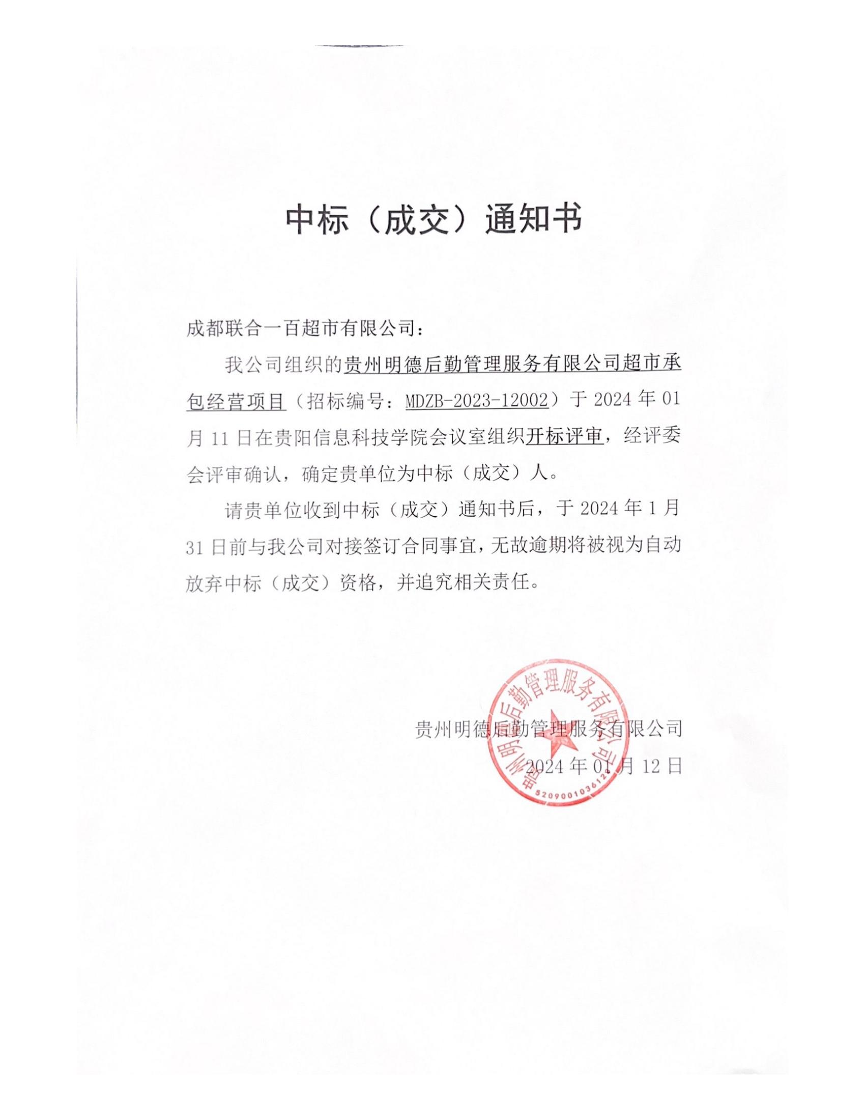 贵州明德后勤管理服务有限公司超市承包经营项目中标(成交)通知书