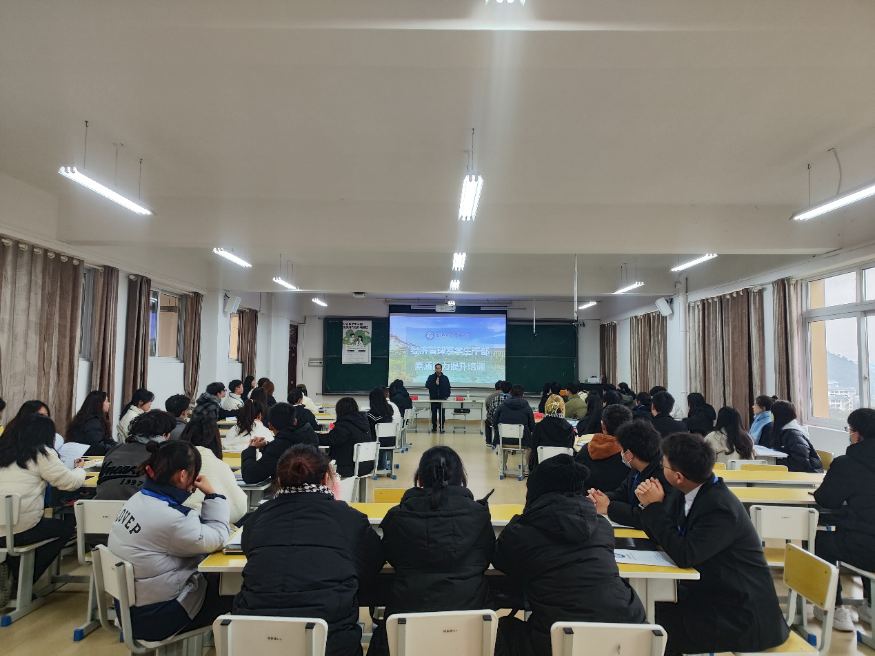 新闻网讯(供稿 邱艳萍 供图 邱艳萍)学生干部是学生组织的管理主体和中坚力量,为增强经济管理系学生干部的管理意识及素质能力,使其在班级管理中发挥更大的作用,2023年12月23日-12月24日,由Beat365唯一官方网站经济管理系主办、人力资源教研室承办的学生干部素质能力提升培训班在创新楼418举行。经济管理系秦黎教授、经济管理系党总支书记朱成龙、经济管理系系办主任韦雅菁、人力资源管理教研室主任邱艳萍、人力资源管理教研室老师张蕊、马柳丹、经管系辅导员张修乐、卢雪等出席活动现场。由经济管理系英语、会计学、电子商务、市场营销、财务管理、工商管理、人力资源、旅游管理等8个专业的班长及团支书组成的参训团队共计80余人参加培训。