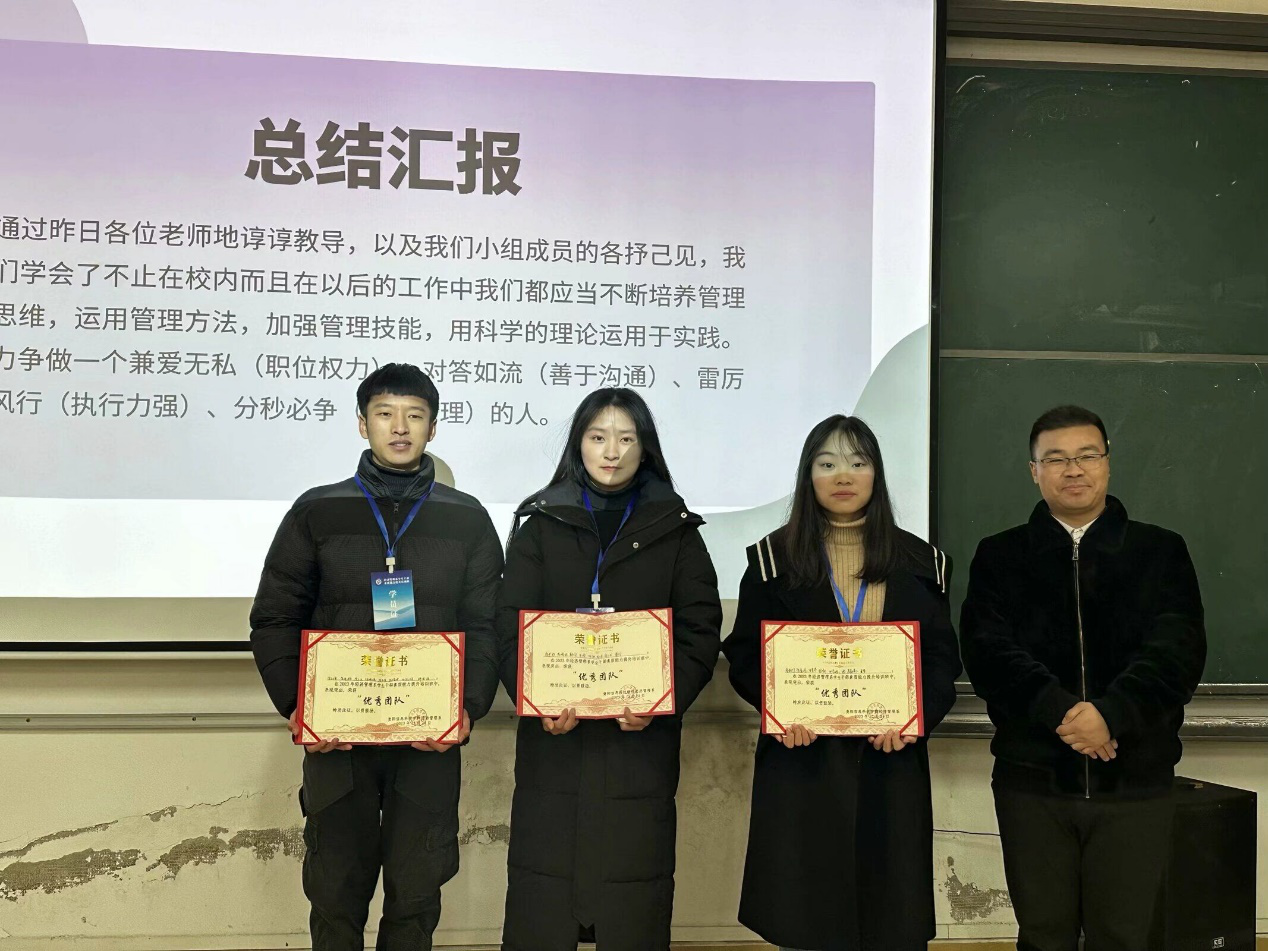 24日上午,小组汇报环节由九组人员通过抽签形式,依次对本次培训成果进行展示,就能力提升方法、学习经验分析及问题改进等方面向评委及同学陈述,辅之以幻灯片、视频短片、演讲等形式全面展示小组学习成果。经角逐,本次汇报共产生三组优秀团队及郑颖竹、曾令增等9名优秀学员,并由经济管理系党总支书记朱成龙及系办主任韦雅菁为获奖团队和优秀学员颁发荣誉证书。