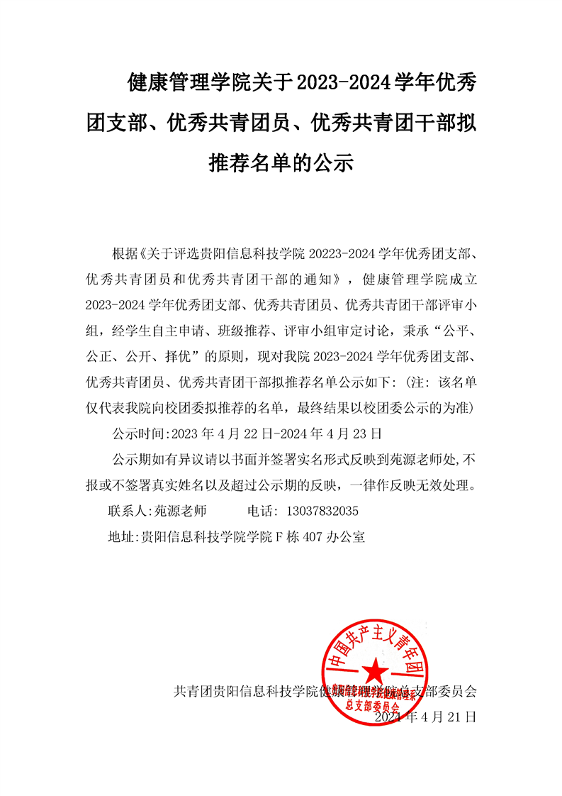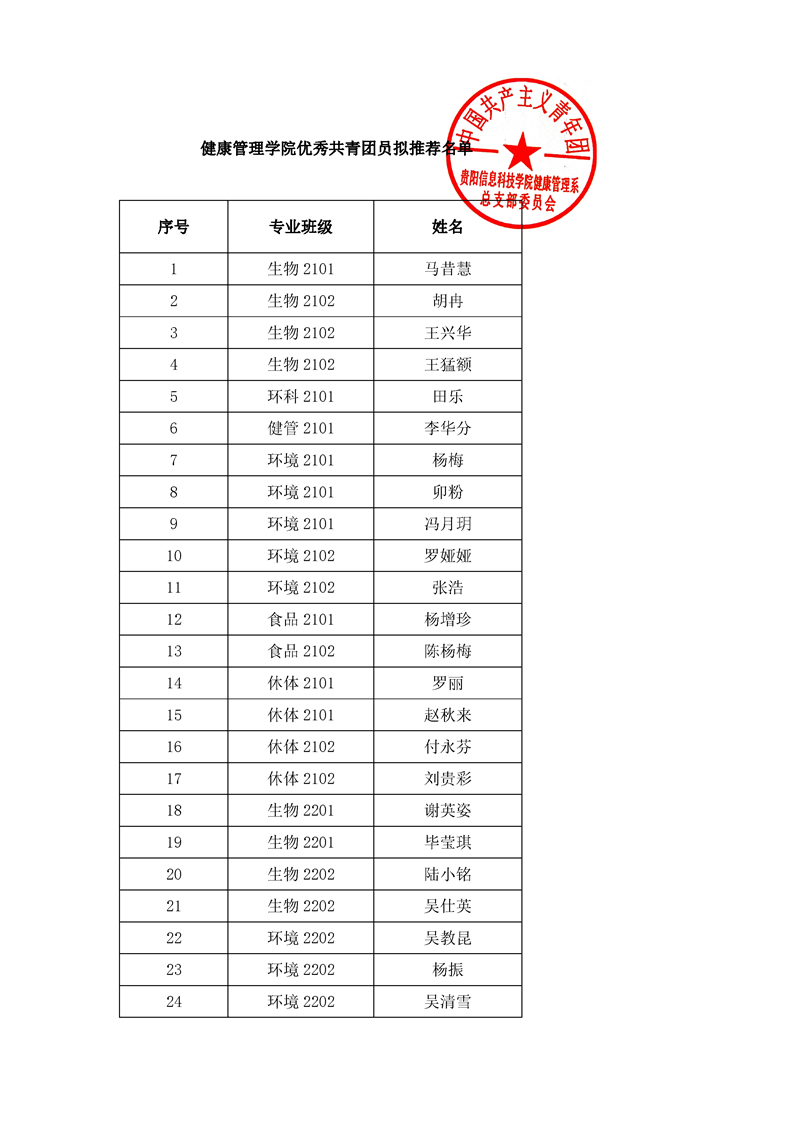 健康管理学院关于2023-2024学年优秀团支部、优秀共青团员、优秀共青团干部拟推荐名单的公示