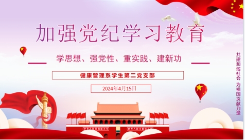 为深入学习贯彻习近平法治思想,深入学习修订后的《中国共产党纪律处分条例》,聚焦学思想、强党性、重实践、建新功总要求,对照凝心铸魂筑牢根本、锤炼品格强化忠诚、实干担当促进发展、践行宗旨为民造福、廉洁奉公树立新风具体目标,2024年4月15日,健康管理学院学生第二党支部在C401召开党纪学习教育专题大会,会议应到党员19人,实到19人,会议由支部书记丁操同志主持。