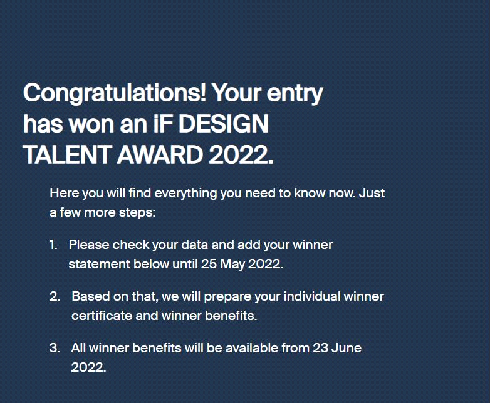 IF设计奖创立于1953年,由德国历史最悠久的工业设计机构创立举办。IF设计新秀奖(IF DESIGN TALENT AWARD)是IF奖中面向全球学生和青年设计师的设计奖项,鼓励创造改变世界的创新设计,致力于探索引领未来产品的设计方向,是全球学生与青年设计英才有机会参加的最高奖项之一。德国“IF奖”和德国红点奖、美国“IDEA奖”并称为“世界三大设计奖”,有设计界“奥斯卡”之称,含金量极高,极具影响力。“iF设计新秀奖”为鼓励设计界新生力量而设置,也是全球设计领域中针对年轻设计师所举办的规模最大、最具名望的竞赛之一,具有国际高品质设计的象征。本次IF设计新秀奖竞赛主题是面向联合国可持续发展目标开展创新、创意设计。