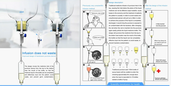 作品《lnfusion does not waste》从可持续发展主题出发,聚焦世界医疗卫生安全、浪费问题,对未来医疗资源节约提供了可行的思路和创新性探索。设计说明:传统输液器的穿刺器入药孔在顶端,导致入药孔平面以下的药液无法有效输出造成浪费,给病人的治疗及经济带来损失,病人通常为了避免浪费而私自将穿刺器稍微向外拔出以达到药液完全流出的目的,此举会使穿刺器暴露在空气中沾染病菌,当换药瓶后穿刺器再次插入药瓶时极易造成对整瓶药液的污染。该设计将穿刺器的入药孔由顶端移至底部靠近瓶口位置,使瓶内药液能够完全有效地输入到病人体内,避免浪费,杜绝病菌污染。