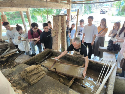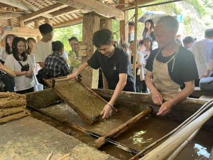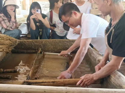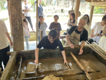 同学们参观完印刷厂后,同学们来到了造纸作坊。在这里,他们亲眼目睹了古法造纸的全过程:从选材、备料到浸泡、捣浆,再到抄纸、晾晒,每一个步骤都凝聚着匠人们的辛勤汗水。特别是当同学们看到匠人们用竹帘从浆池中抄起一张张薄如蝉翼的纸时,无不惊叹于这项工艺的精湛和神奇。