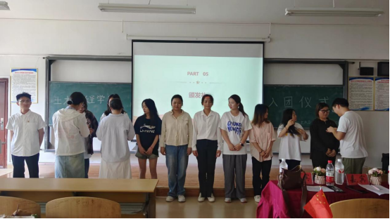 在仪式开始,在场全体师生起立,唱响国歌,国歌声毕,入团仪式拉开帷幕。随后主持人宣读新团员名单,城规2301田萍、地信2001张蕾、工管2201向可欣、工管2302沈宇鑫、建工2101吴远龙、建筑2001张巧灵、建筑2201望诗洋、土木2302温臻、土木2302石雨彤、土木2304李思思、土木2306胡媛媛、造价2201胡琳、造价2201詹凯、造价2201张雪、造价2202罗舒琪、造价2301曹珂鑫、造价2301李欣宇十七名同学光荣地成为了中国共产主义青年团的一员,老团员为全体新团员佩戴团徽。