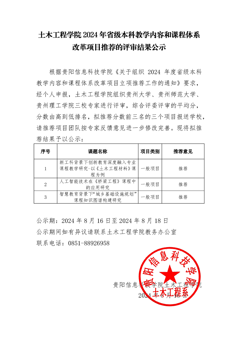 土木工程学院 2024 年省级本科教学内容和课程体系 改革项目推荐的评审结果公示