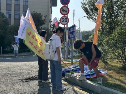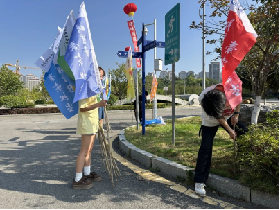 晨光初破,志愿者们遍布校园,路上留下了他们坚实的足迹。彩旗从校门一路延至图书馆、教学楼、宿舍楼。每一面旗帜的屹立,都是志愿者们汗水与互动的结晶。日光倾城,志愿者们的汗水如珠,掌心泛红,而彩旗随风轻舞,寓意新生前程灿烂,似锦繁华。