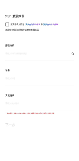 下一步默认灰色不可操作。所在院校,学号,真实姓名填写完成。下一步亮起,可进行操作。