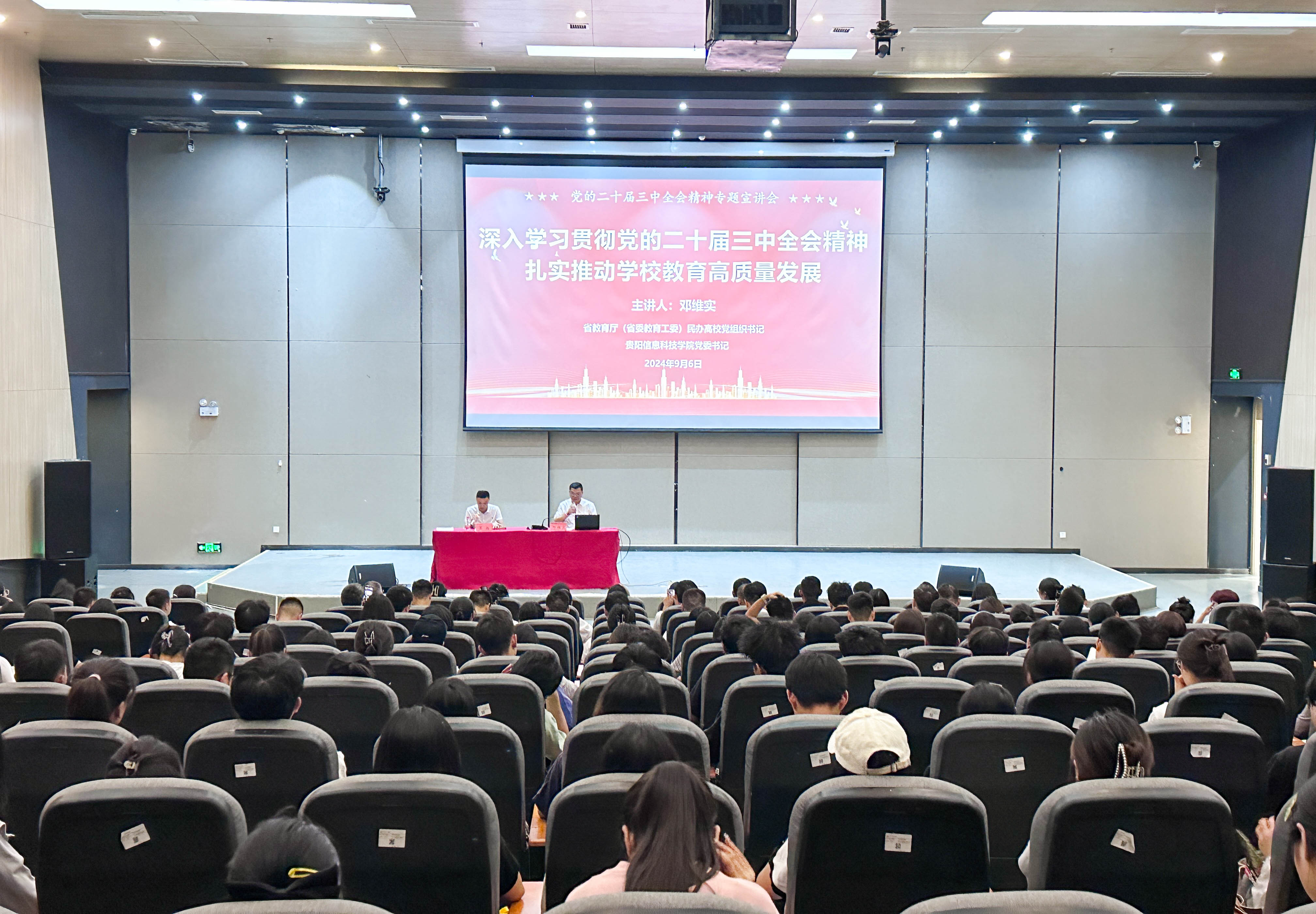 新闻网讯(供稿/供图 党群工作部)9月6日上午,学校在图书馆二楼学术报告厅举行宣传贯彻党的二十届三中全会精神专题宣讲。省教育厅(省委教育工委)民办高校党组织书记、学校党委书记邓维实作专题宣讲,校办公室主任吴扬主持。Beat365各党总支书记,全体行政人员、辅导员、思政课教师及学生代表共300余人参加。