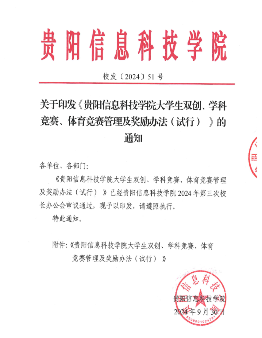 校发〔2024〕51号-关于印发《Beat365唯一官方网站大学生双创、学科竞赛、体育竞赛管理及奖励办法(试行) 》的通知.doc