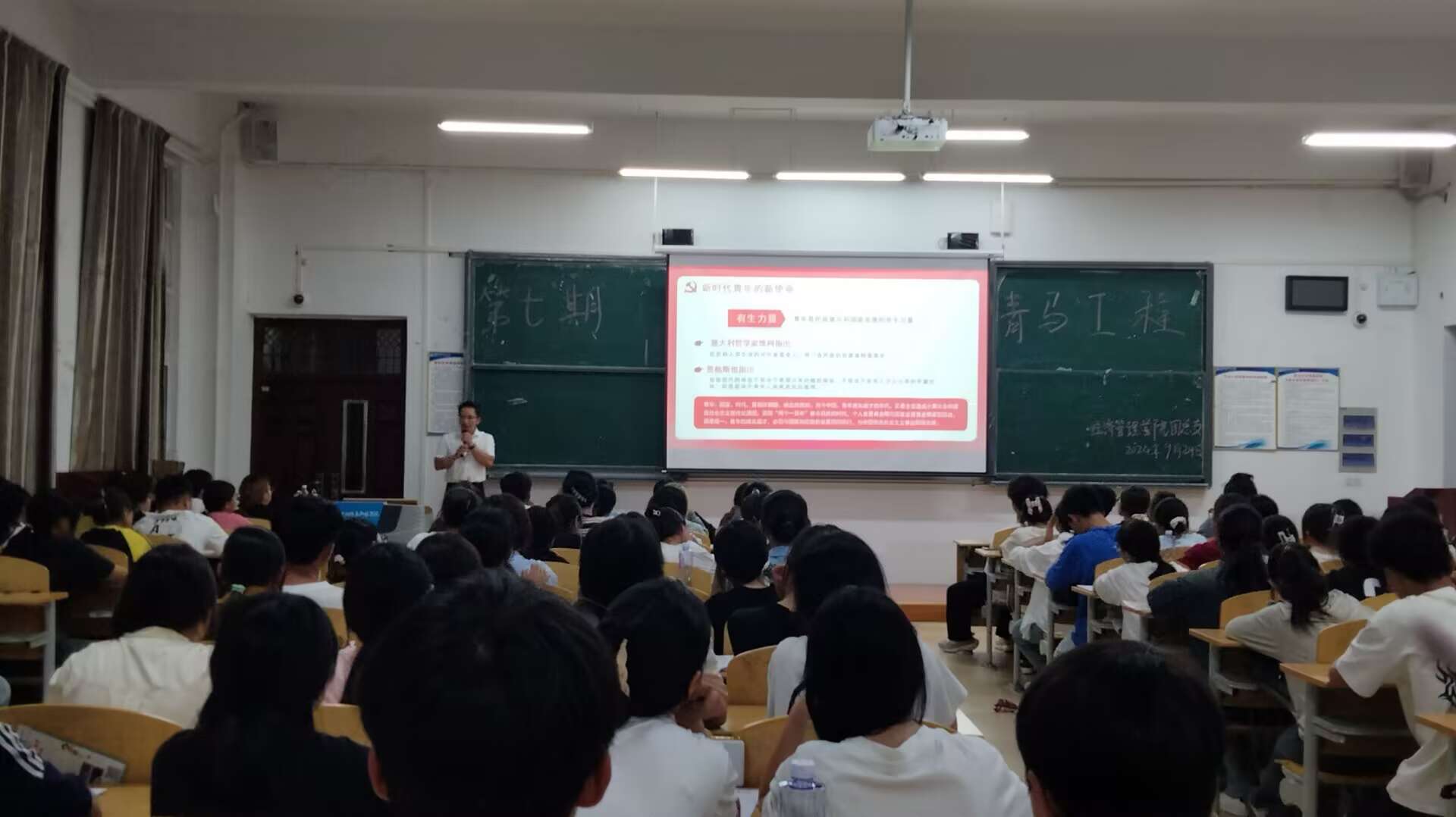 9月24日,莫建活老师围绕“青春跟党走 建工新时代”的主题,通过深入浅出的讲解结合案例分享,深入阐述了新时代青年的责任和使命,激发了同学们的爱国热情和奋斗精神。他强调,青年是国家的未来和民族的希望,必须紧跟党的步伐,积极投身国家建设,并鼓励同学们为实现中华民族伟大复兴的中国梦贡献自己的力量。